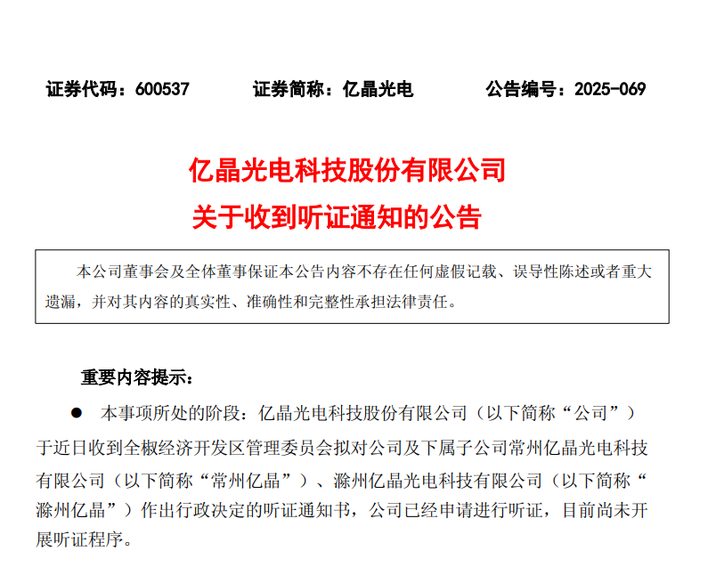 针对此次事项,亿晶光电表示将积极应对听证,依法行使陈述、申辩权利,维护公司及全体股东特别是中小股东合法权益。公司强调,目前听证及最终行政决定结果尚不确定,对本期及期后利润的影响暂无法判断,将持续关注进展并及时履行信息披露义务。