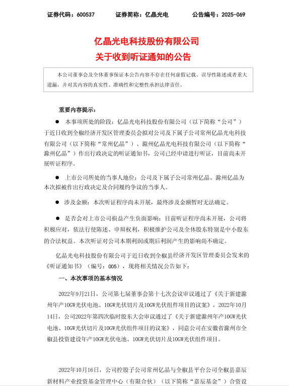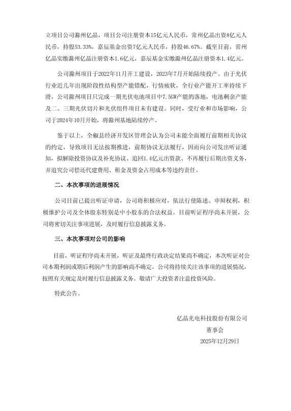 12月28日晚间,亿晶光电(600537)发布公告,公司及下属子公司常州亿晶、滁州亿晶收到全椒经济开发区管理委员会的听证通知书,因滁州年产30GW光伏项目未按协议推进且已停产,拟被解除投资协议、追回1.4亿元政府平台出资款,并追究代建费用等违约责任。目前公司已申请听证,相关程序尚未开展。