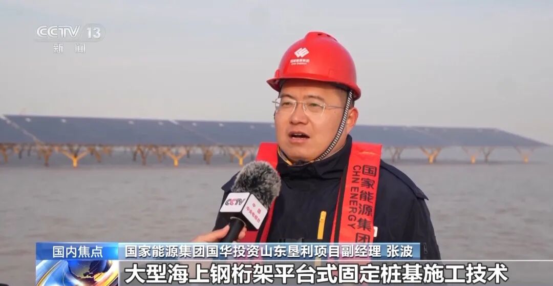 国家能源集团国华投资山东垦利项目副经理张波表示,项目在全国创新应用大型海上钢桁架平台式固定桩基施工技术,采用“四桩基础+光伏平台”优化结构,平台倾角为精准调校的15度,不仅能抵抗11级强风和冬季冰情,还能节约项目用钢量超10%,为同类项目开发建设提供经验借鉴。