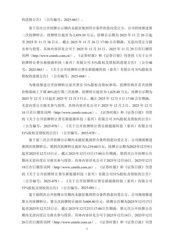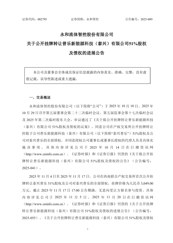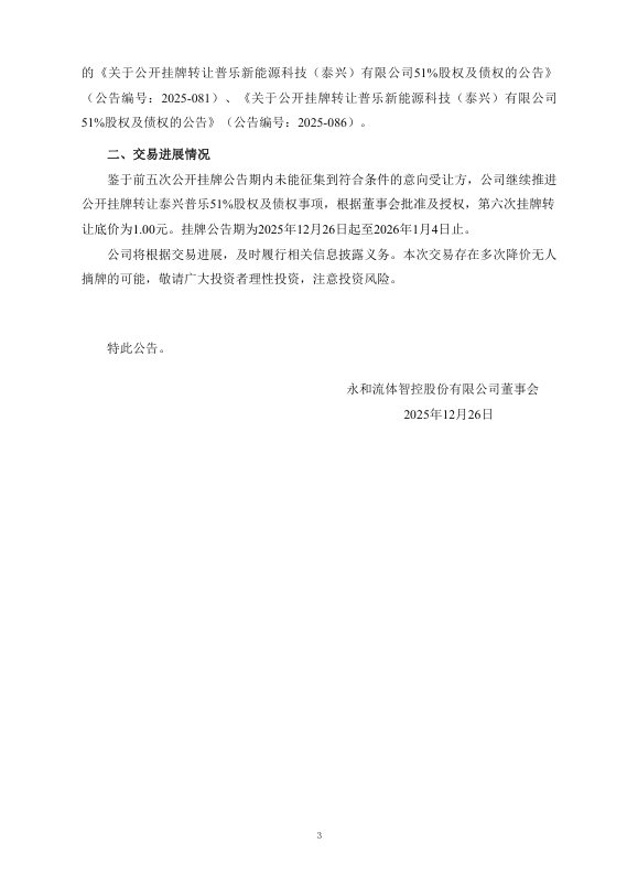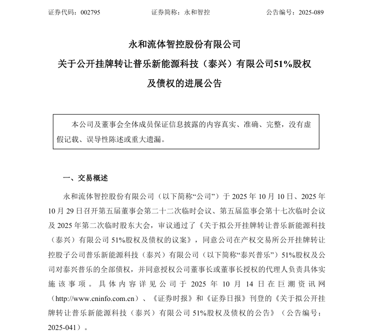 12月26日,永和智控(002795)发布公告,公司拟以1元底价第六次公开挂牌转让控股子公司普乐新能源科技(泰兴)有限公司(下称“泰兴普乐”)51%股权及全部债权。在此之前,公司已先后五次降价挂牌,底价从初始的3049万元降至609.8万元,均因无人报名而失败,此次1元底价较首次挂牌价降幅达99.9997%。