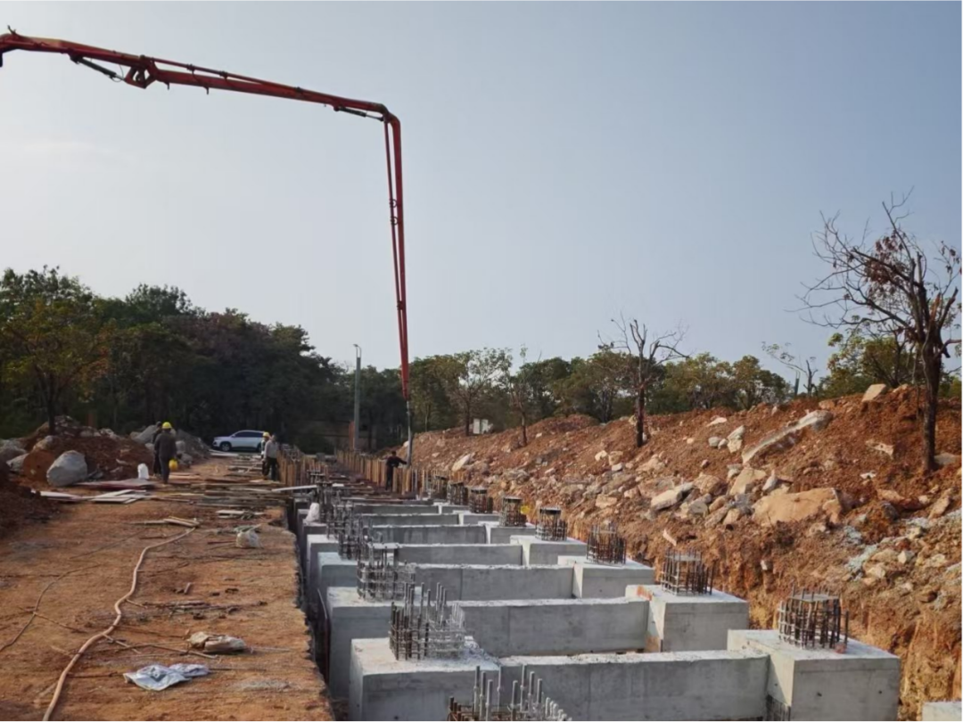 现场部分地块柔性光伏支架系统和组件安装已完成,其余地块正进行主索张拉和基础浇筑中。项目所在地地质条件恶劣,乱石纵横,现场团队正克服困难加紧施工中。