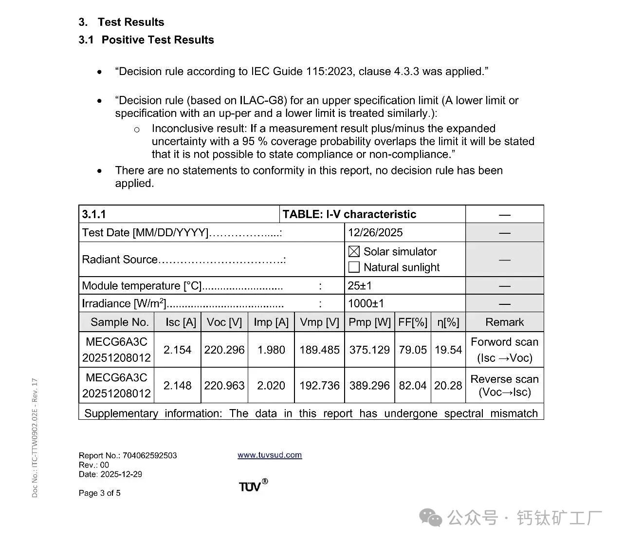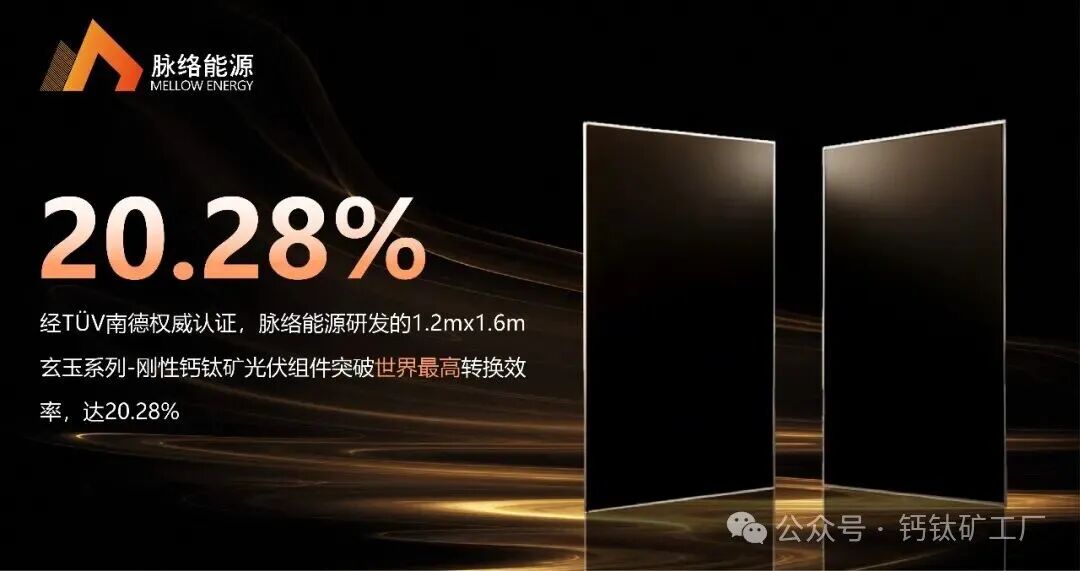 近期,脉络能源自主研发的 1.2m×1.6m玄玉系列-刚性钙钛矿光伏组件通过 TÜV 南德权威检测认证,全面积能量转化效率达 20.28%,创造世界纪录。标志着我国在大尺寸钙钛矿光伏技术领域实现关键性跨越,进一步验证了脉络能源自主研发路线的可行性与先进性。