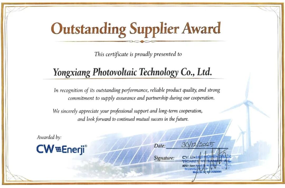 近日,土耳其CW公司授予永祥光伏科技年度优秀供应商奖,这份沉甸甸的荣誉,不仅是对双方一年来风雨同舟、长期稳定合作的高度肯定,更是对公司卓越产品品质、高效服务水平与可靠履约能力的权威认可。