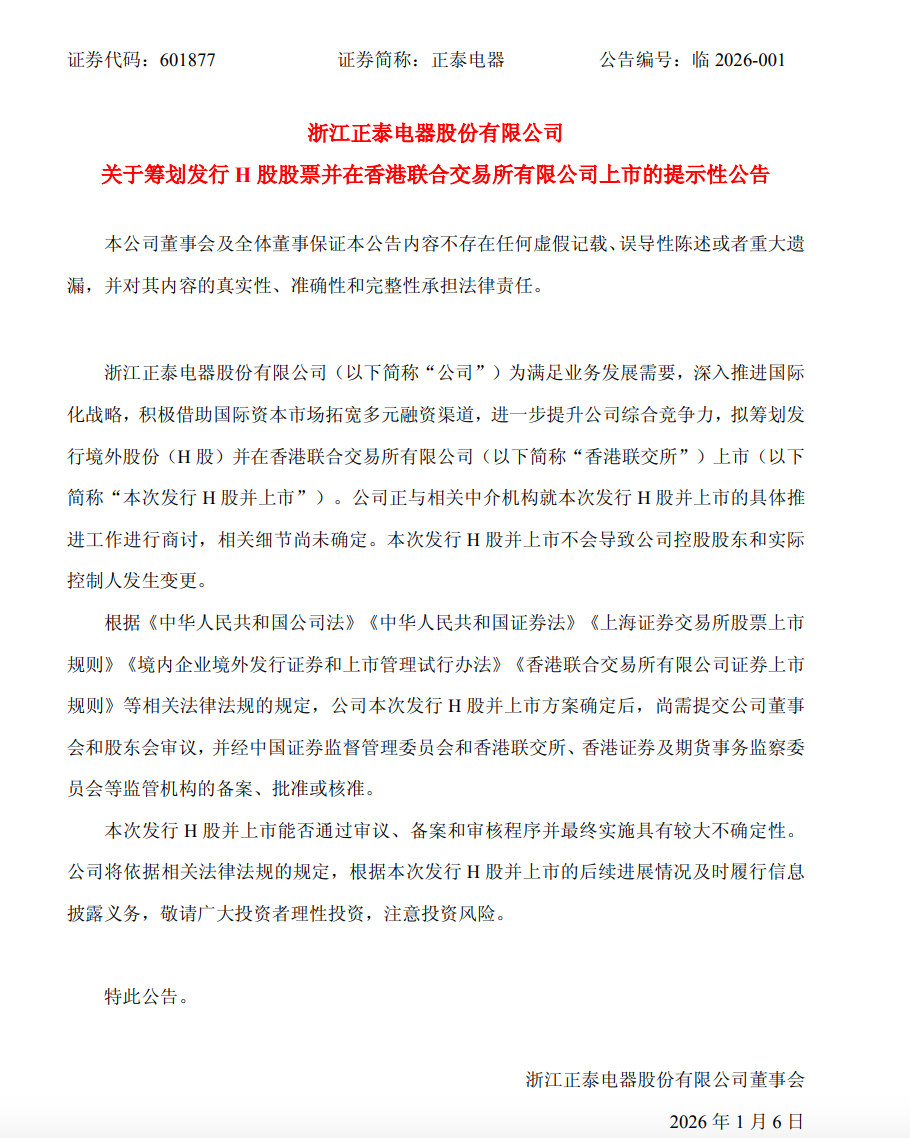 1月5日晚间,正泰电器(601877.SH)发布公告称,公司为满足业务发展需要,深入推进国际化战略,积极借助国际资本市场拓宽多元融资渠道,进一步提升公司综合竞争力,拟筹划发行境外股份(H股)并在香港联合交易所有限公司(以下简称“香港联交所”)上市。