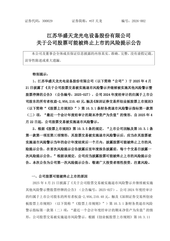 1月5日,*ST天龙(300029)发布关于公司股票可能被终止上市的风险提示公告。