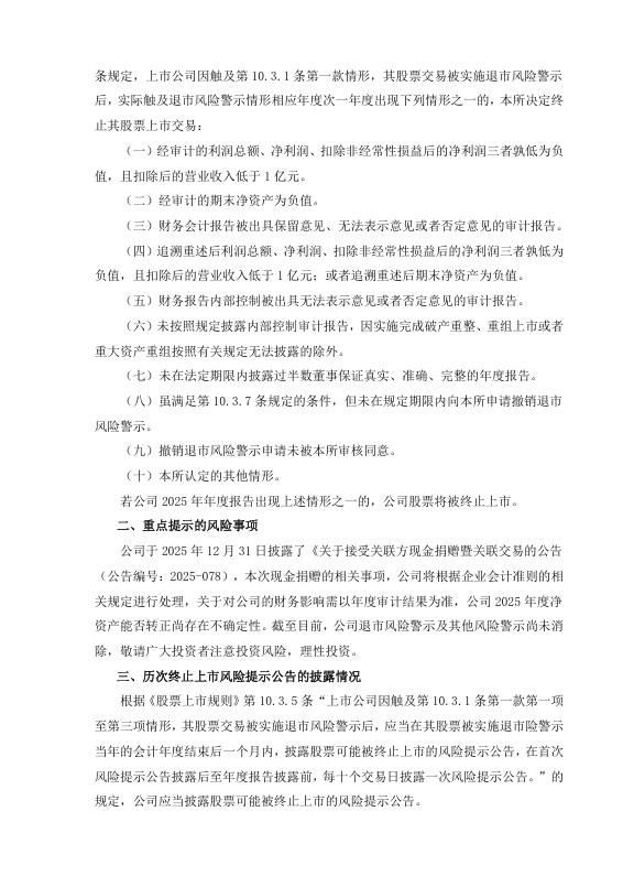 公司于2025年12月31日披露了《关于接受关联方现金捐赠暨关联交易的公告(公告编号:2025-078),本次现金捐赠的相关事项,公司将根据企业会计准则的相关规定进行处理,关于对公司的财务影响需以年度审计结果为准,公司2025年度净资产能否转正尚存在不确定性。截至目前,公司退市风险警示及其他风险警示尚未消除,敬请广大投资者注意投资风险,理性投资。