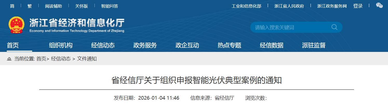 1月4日,浙江省经信厅发布<<关于组织申报智能光伏典型案例的通知>>,典型案例申报范围包含光储融合、建筑光伏、交通运输应用、农业农村应用、光伏制氢/氨/醇、水上光伏、光伏绿色化、关键信息技术、先进光伏产品、新型设施和实证检测10个方面。申报主体为案例组织实施单位,可以是相关应用单位、制造企业、案例所在园区、第三方集成服务机构等。光伏系统安装在建筑上的,应具备应急自动断电功能,并与建筑本体牢固连接,保证结构安全、防火安全和不漏水不渗水,与其他产业融合发展的要确保主导功能不受影响。