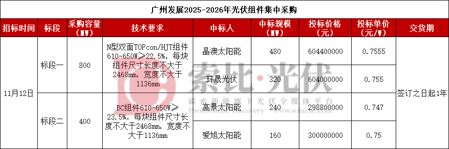 1月6日,广州发展2025-2026年光伏组件集中采购中标结果公示。