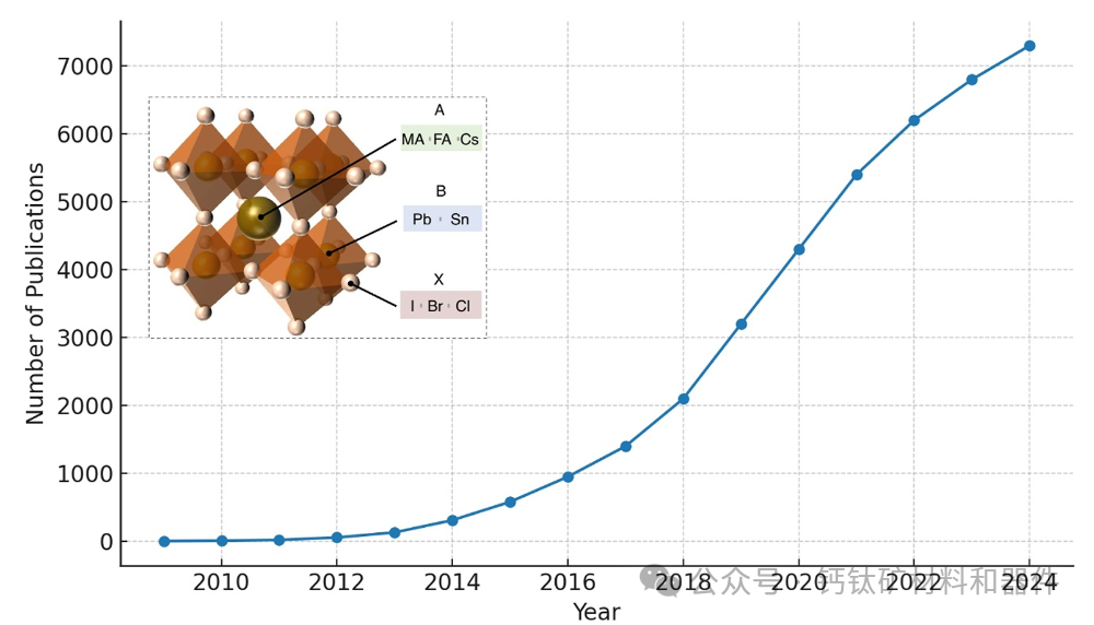 图1:2009年至2024年期间每年关于钙钛矿太阳能电池的出版物数量。迄今为止发表的文章总数超过37,000篇。插图显示了ABX₃钙钛矿的立方晶格结构,具有角共享八面体。