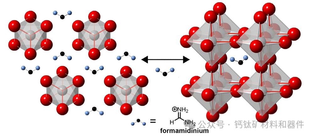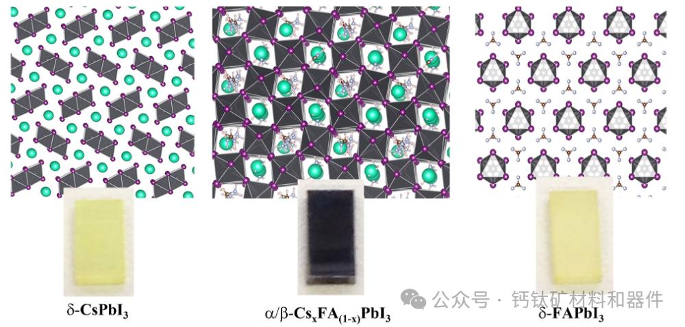 图2显示了FAPbI₃的黄色δ相和黑色α相的晶体结构。在没有稳定策略的操作温度下,δ相占主导,并通过增强非辐射复合降低性能。