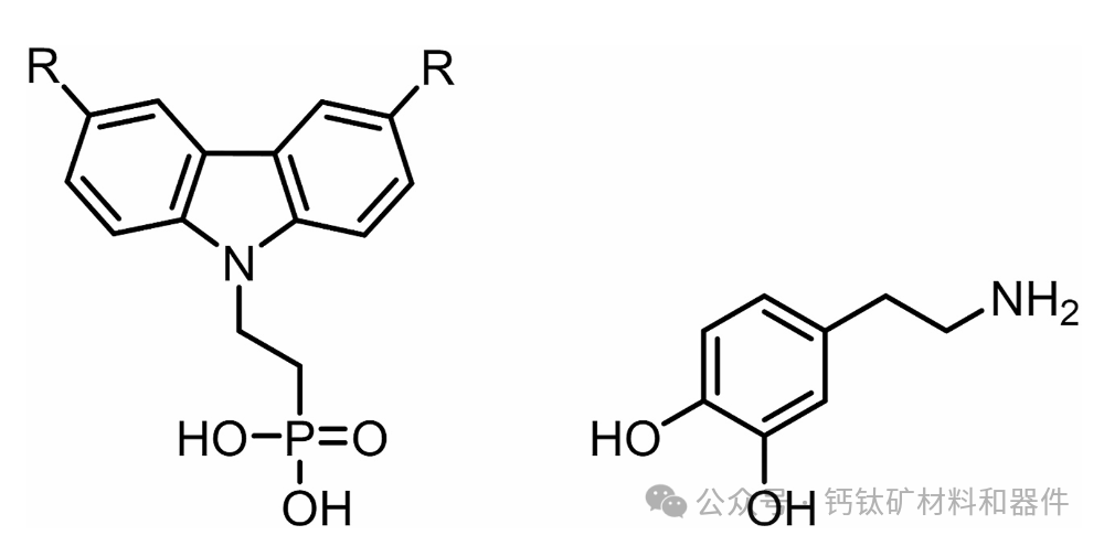 图4 | 在p-i-n型钙钛矿太阳能电池中用作分子空穴导体的咔唑衍生物的化学结构。R代表氢、烷基或烷氧基取代基。神经递质多巴胺的化学结构,其作为真正的自组装单分子层,通过浸涂沉积在n-i-p型钙钛矿太阳能电池中[90]。它作为SnO₂量子点和钙钛矿薄膜之间的双功能分子连接剂,提升了其光伏性能。儿茶酚的OH-基团与SnO₂颗粒表面的Sn(IV)离子形成螯合键,而铵基团则引导钙钛矿的结晶。