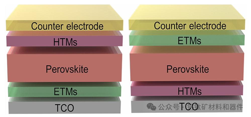图5 | n-i-p(左)和p-i-n(右)钙钛矿太阳能电池的器件架构。