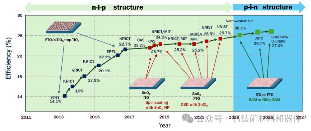 图6 | n–i–p(左)和 p–i–n(右)钙钛矿太阳能电池的器件架构。认证 PSC 效率随时间的演变。颜色表示透明导电氧化物(TCO)上的载流子传输层:黑色(2013–2017)cTiO₂/mTiO SAM 或 NiOₓ/SAM(图源:Jaeki Jeon)。