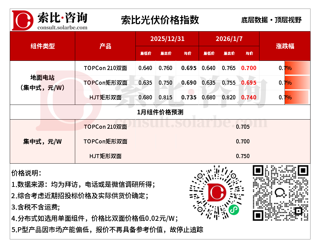 本周组件价格上涨。地面电站TOPCon210双面0.700元/W,TOPCon矩形双面0.695元/W,HJT矩形双面0.740元/W。