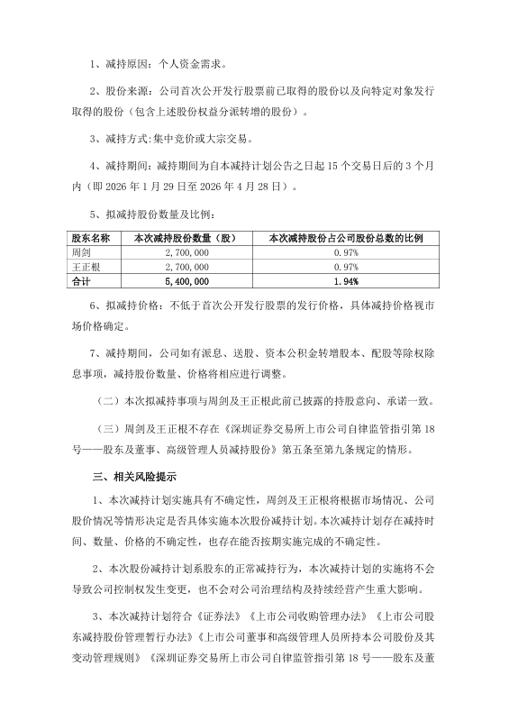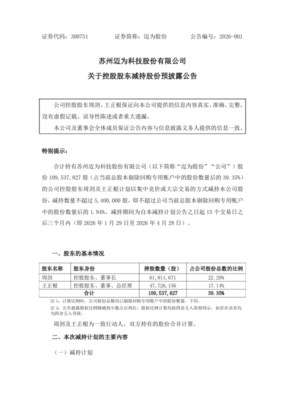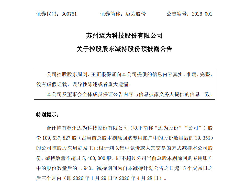 公告显示,周剑及王正根为一致行动人,合计持有迈为股份1.095亿股,占公司当前总股本剔除回购专用账户股份后的39.35%。本次拟减持股份来源为公司首次公开发行股票前已取得的股份及向特定对象发行取得的股份(含权益分派转增股份),减持方式为集中竞价或大宗交易,减持期间为公告发布之日起15个交易日之后的三个月内,即2026年1月29日至4月28日,减持价格不低于公司首次公开发行股票的发行价格,具体视市场价格确定。