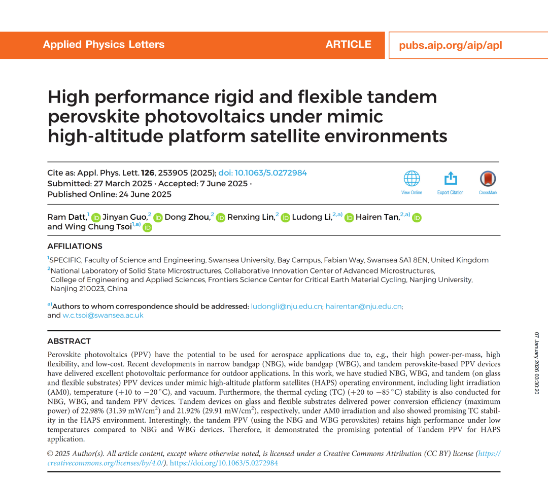 仁烁光能已与欧洲宇航局资助的英国斯旺西大学实验室就全钙钛矿叠层电池太空应用进行过合作实验,主要测试钙钛矿组件冷热循环、耐离子辐照两方面性能。相关成果于2025年7月发表在“Applied Physics Letters《应用物理快报》”,论文题为“High performance rigid and flexible tandem perovskite photovoltaics under mimic high-altitude platform satellite environments《高性能刚性和柔性全钙钛矿叠层光伏在模拟高空平台卫星环境中的表现》”。