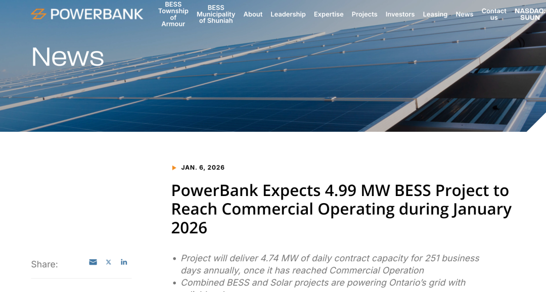 公司确认,其位于安大略省Cramahe的SFF-06储能系统项目已完成最终调试,预计将在2026年1月正式进入商业运营(COD)。这将成为PowerBank的首个商运级储能资产,也标志着公司在北美能源基础设施领域从“项目开发”迈向“长期资产运营”的正式转型。