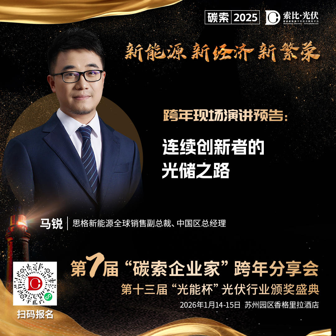 2026年1月15日,于苏州园区香格里拉酒店举办的第七届“碳索”企业家跨年分享会上,思格新能源全球销售副总裁、中国区总经理马锐先生将莅临现场,发表题为 《连续创新者的光储之路》 的主题演讲。他的分享将为业界提供关于成长型企业如何穿越周期、实现高质量发展的真实案例与深度思考。