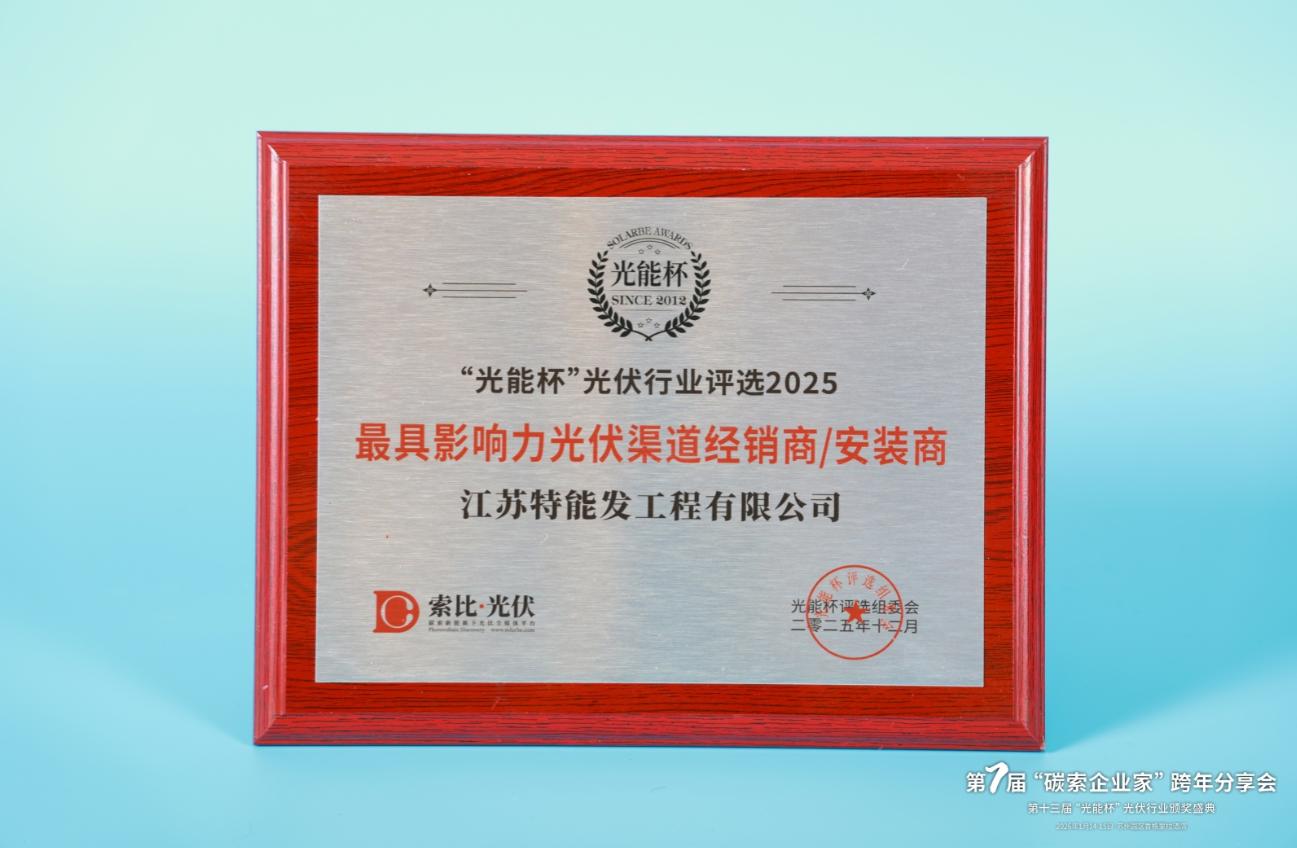 本届“光能杯”共有300余家光伏企业参与报名评选,角逐年度荣誉。此次颁奖盛典中,江苏特能发工程有限公司凭借强大创新力、出色的品质与服务、卓越的品牌影响力,荣膺2025年度最具影响力光伏渠道经销商/安装商。