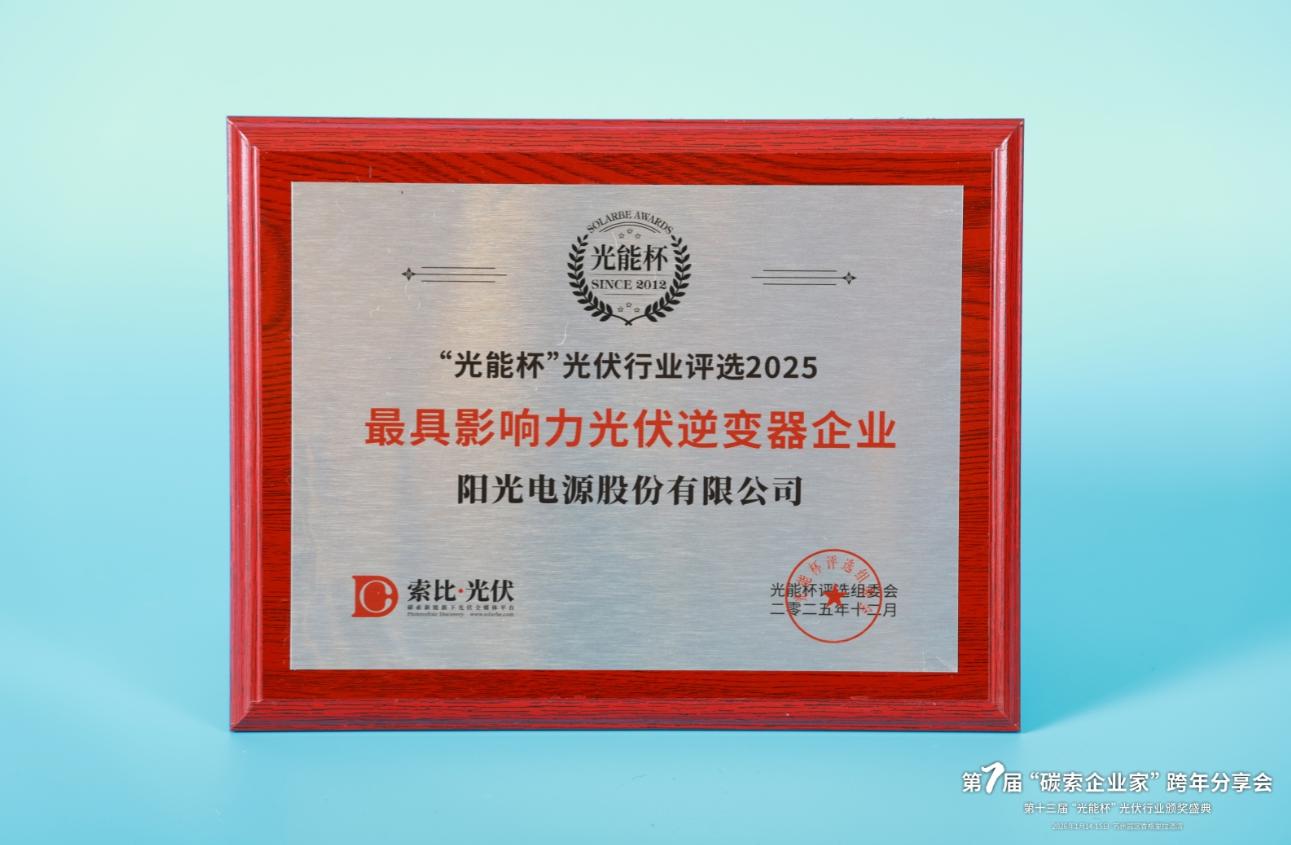本届“光能杯”共有300余家光伏企业参与报名评选,角逐年度荣誉。此次颁奖盛典中,阳光电源股份有限公司凭借强大创新力、出色的品质与服务、卓越的品牌影响力,荣膺2025年度最具影响力光伏逆变器企业。