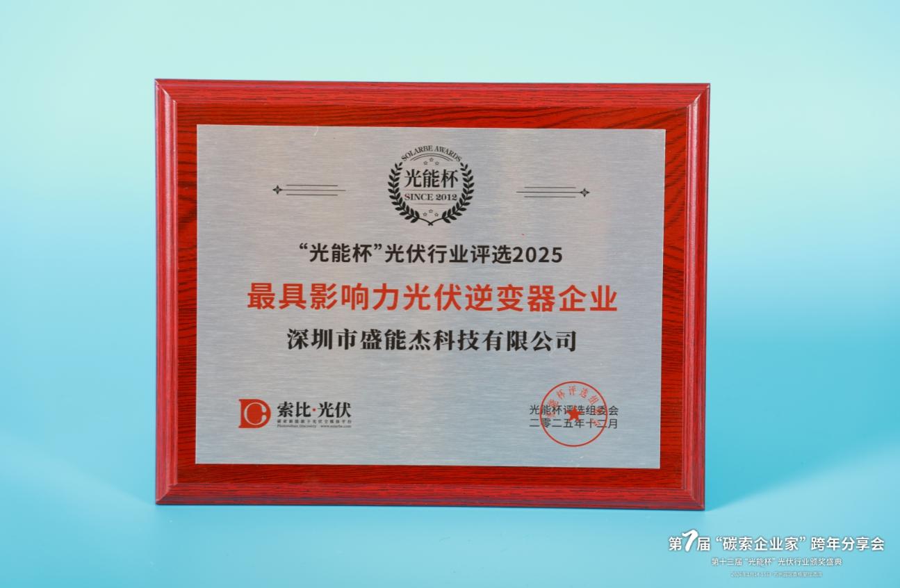 本届“光能杯”共有300余家光伏企业参与报名评选,角逐年度荣誉。此次颁奖盛典中,深圳市盛能杰科技有限公司凭借强大创新力、出色的品质与服务、卓越的品牌影响力,荣膺2025年度最具影响力光伏逆变器企业。