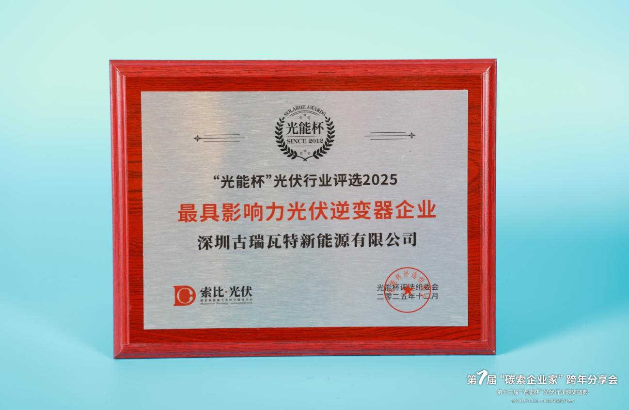 本届“光能杯”共有300余家光伏企业参与报名评选,角逐年度荣誉。此次颁奖盛典中,深圳古瑞瓦特新能源有限公司凭借强大创新力、出色的品质与服务、卓越的品牌影响力,荣膺2025年度最具影响力光伏逆变器企业。