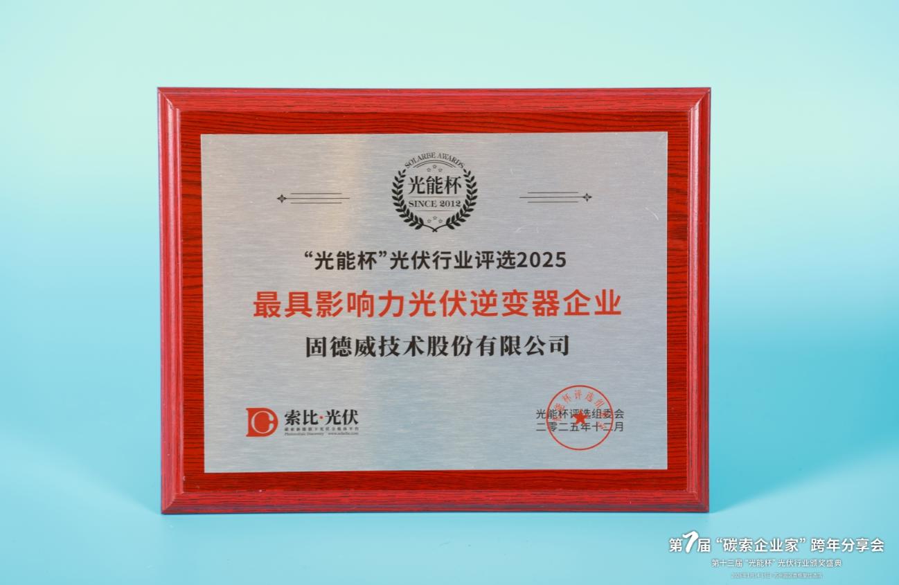 本届“光能杯”共有300余家光伏企业参与报名评选,角逐年度荣誉。此次颁奖盛典中,固德威技术股份有限公司凭借强大创新力、出色的品质与服务、卓越的品牌影响力,荣膺2025年度最具影响力光伏逆变器企业。
