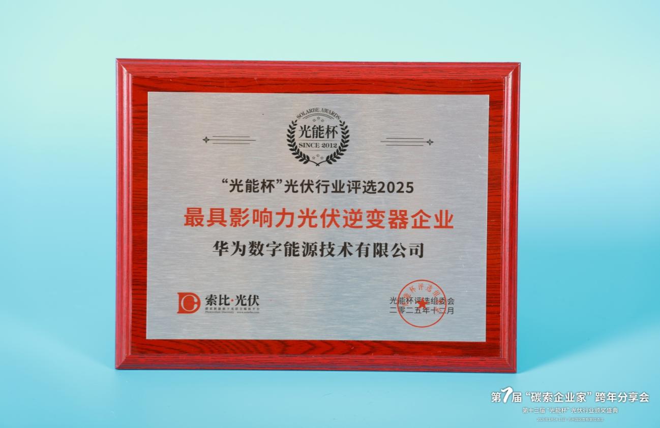 本届“光能杯”共有300余家光伏企业参与报名评选,角逐年度荣誉。此次颁奖盛典中,华为数字能源技术有限公司凭借强大创新力、出色的品质与服务、卓越的品牌影响力,荣膺2025年度最具影响力光伏逆变器企业。