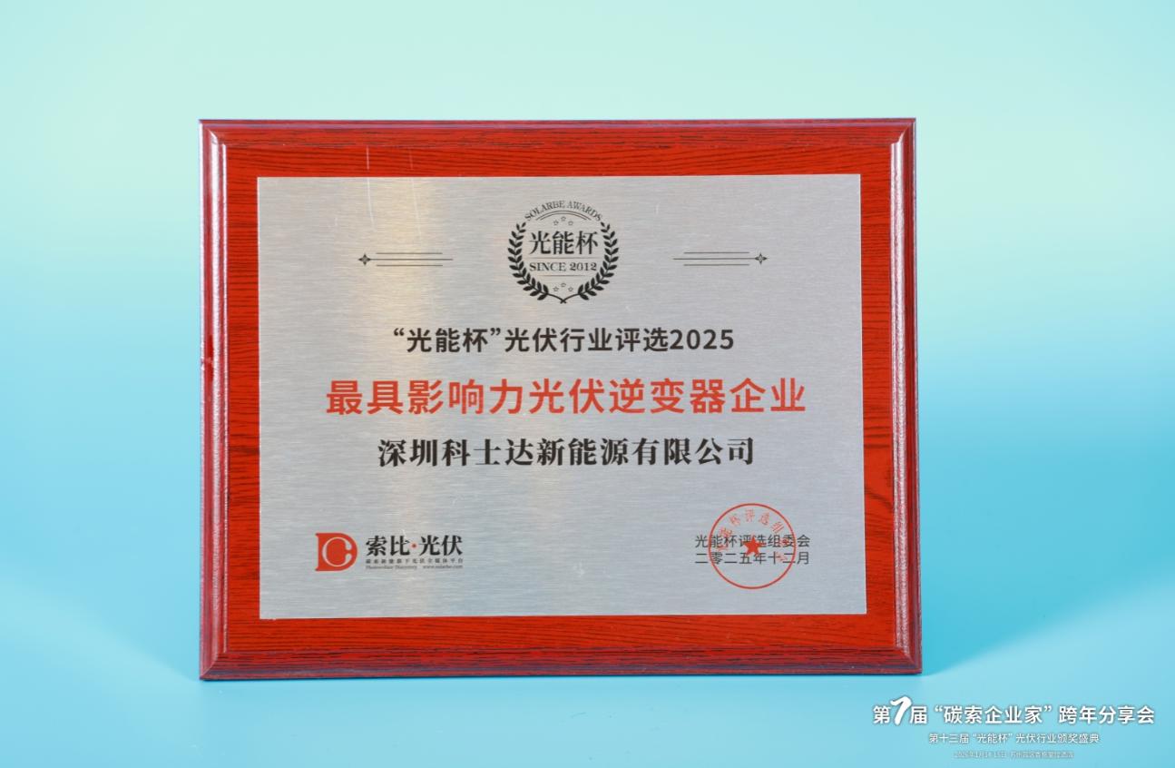 本届“光能杯”共有300余家光伏企业参与报名评选,角逐年度荣誉。此次颁奖盛典中,深圳科士达新能源有限公司凭借强大创新力、出色的品质与服务、卓越的品牌影响力,荣膺2025年度最具影响力光伏逆变器企业。