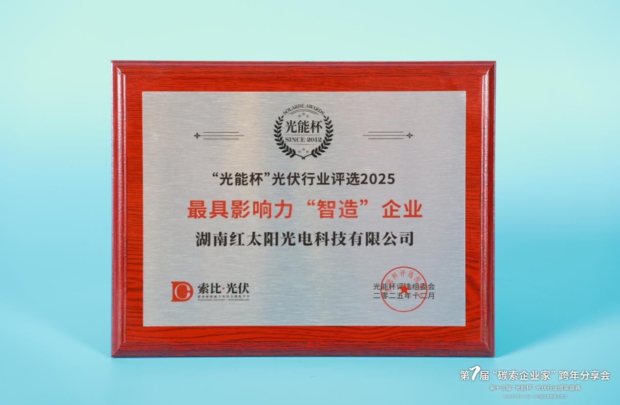 本届“光能杯”共有300余家光伏企业参与报名评选,角逐年度荣誉。此次颁奖盛典中,湖南红太阳光电科技有限公司凭借强大创新力、出色的品质与服务、卓越的品牌影响力,荣膺2025年度最具影响力“智造”企业。