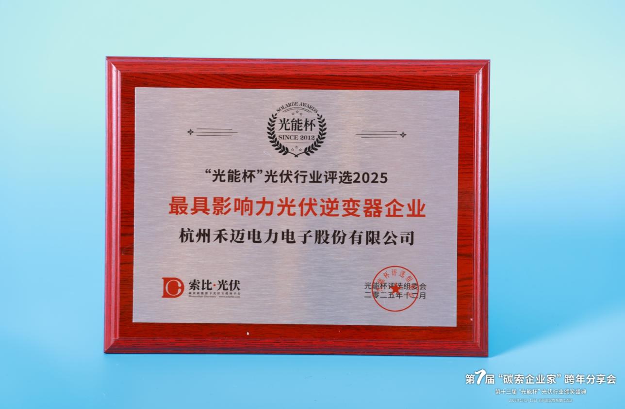 本届“光能杯”共有300余家光伏企业参与报名评选,角逐年度荣誉。此次颁奖盛典中,杭州禾迈电力电子股份有限公司凭借强大创新力、出色的品质与服务、卓越的品牌影响力,荣膺2025年度最具影响力光伏逆变器企业。