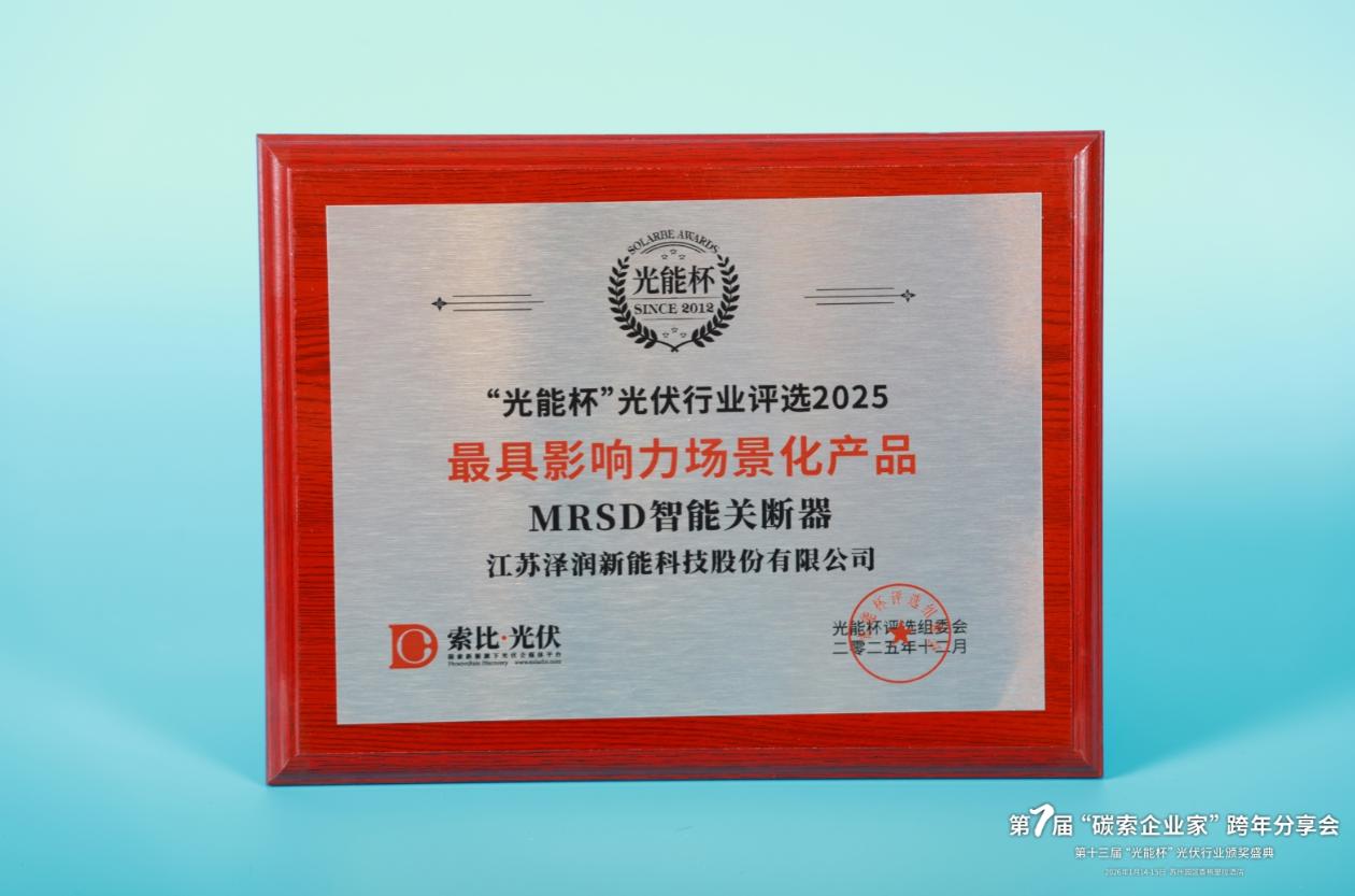 本届“光能杯”共有300余家光伏企业参与报名评选,角逐年度荣誉。此次颁奖盛典中,江苏泽润新能科技股份有限公司凭借强大创新力、出色的品质与服务、卓越的品牌影响力,荣膺2025年度最具影响力场景化产品。