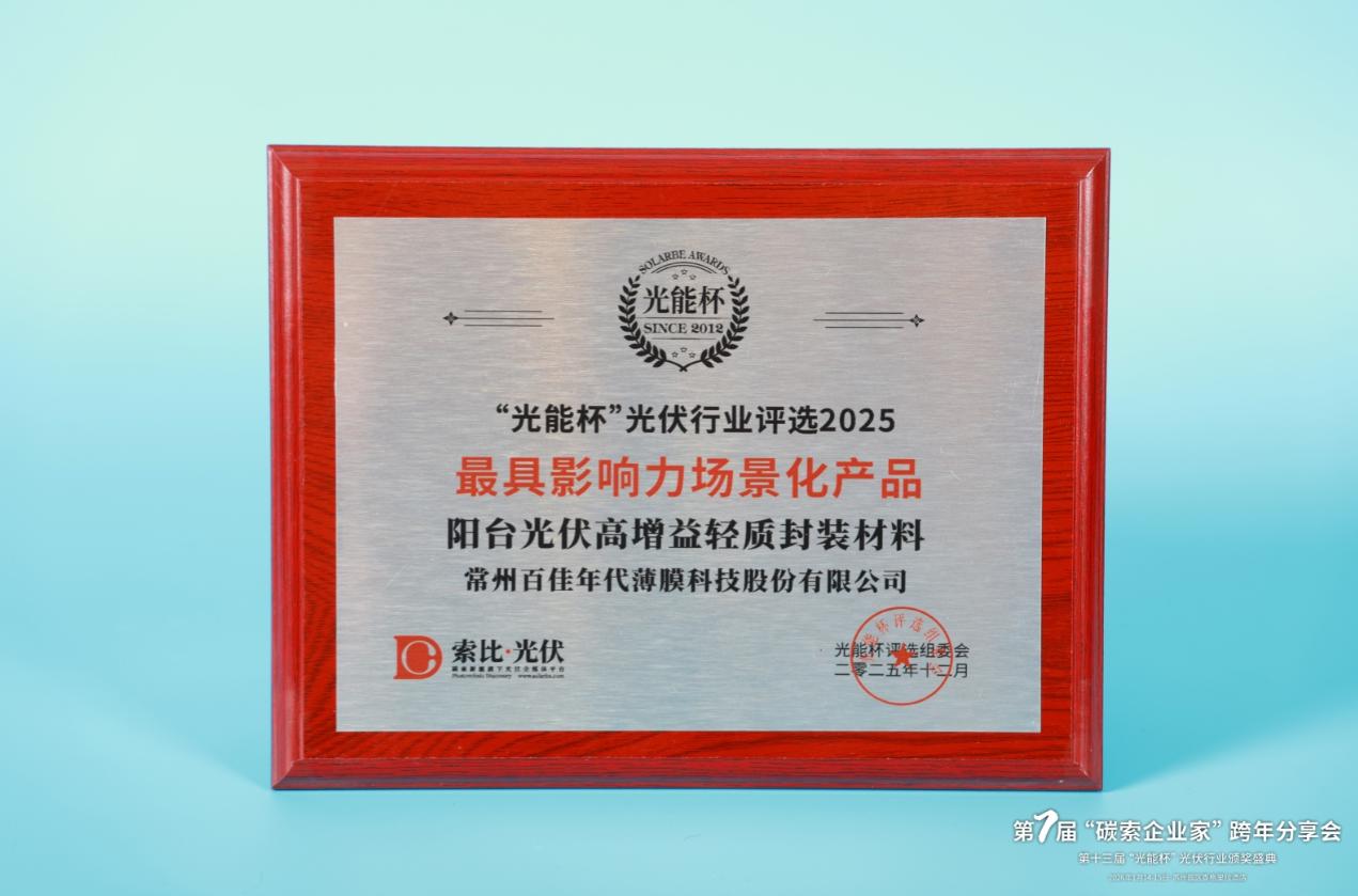 本届“光能杯”共有300余家光伏企业参与报名评选,角逐年度荣誉。此次颁奖盛典中,常州百佳年代薄膜科技股份有限公司凭借强大创新力、出色的品质与服务、卓越的品牌影响力,荣膺2025年度最具影响力场景化产品。