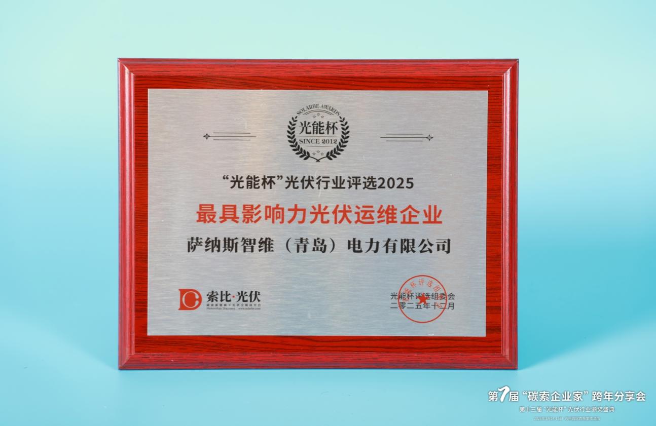 本届“光能杯”共有300余家光伏企业参与报名评选,角逐年度荣誉。此次颁奖盛典中,萨纳斯智维(青岛)电力有限公司凭借强大创新力、出色的品质与服务、卓越的品牌影响力,荣膺2025年度最具影响力光伏运维企业。