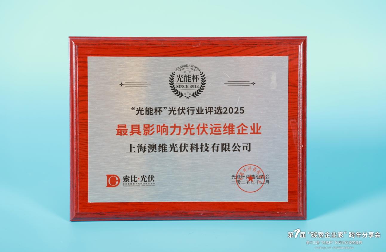 本届“光能杯”共有300余家光伏企业参与报名评选,角逐年度荣誉。此次颁奖盛典中,上海澳维光伏科技有限公司凭借强大创新力、出色的品质与服务、卓越的品牌影响力,荣膺2025年度最具影响力光伏运维企业。