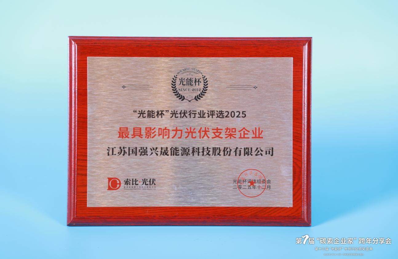 本届“光能杯”共有300余家光伏企业参与报名评选,角逐年度荣誉。此次颁奖盛典中,江苏国强兴晟能源科技股份有限公司凭借强大创新力、出色的品质与服务、卓越的品牌影响力,荣膺2025年度最具影响力光伏支架企业。