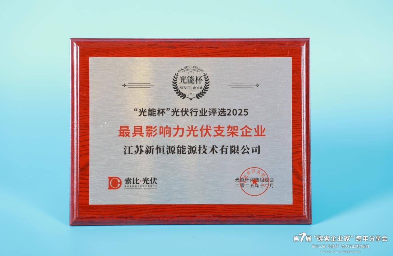 本届“光能杯”共有300余家光伏企业参与报名评选,角逐年度荣誉。此次颁奖盛典中,江苏新恒源能源技术有限公司凭借强大创新力、出色的品质与服务、卓越的品牌影响力,荣膺2025年度最具影响力光伏支架企业。