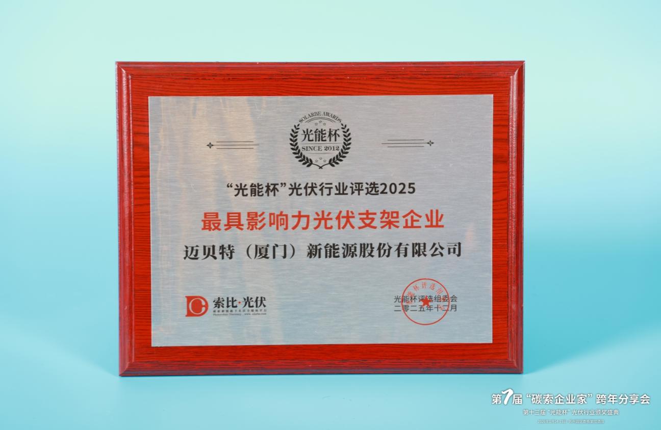 本届“光能杯”共有300余家光伏企业参与报名评选,角逐年度荣誉。此次颁奖盛典中,迈贝特(厦门)新能源股份有限公司凭借强大创新力、出色的品质与服务、卓越的品牌影响力,荣膺2025年度最具影响力光伏支架企业。
