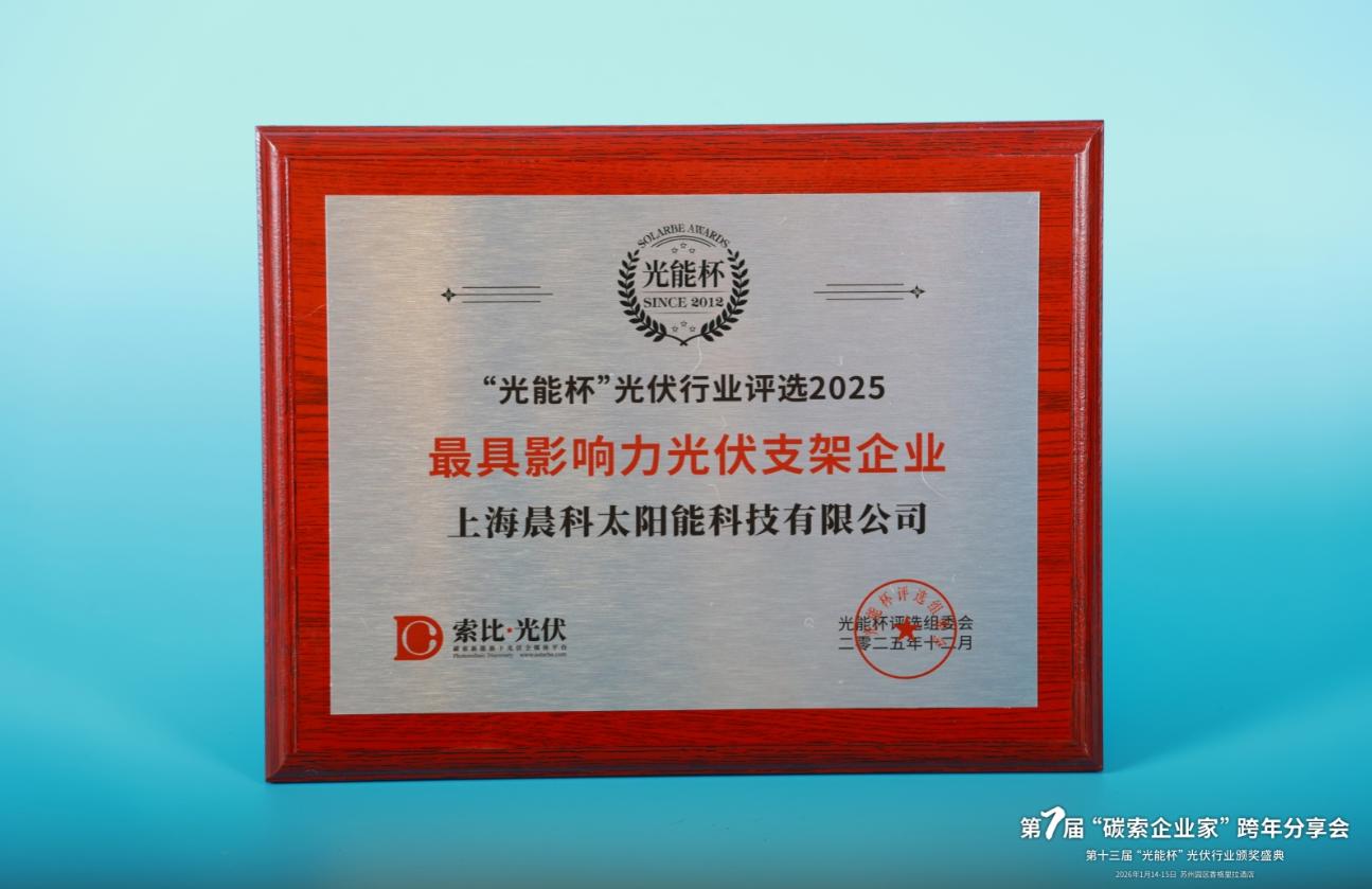 本届“光能杯”共有300余家光伏企业参与报名评选,角逐年度荣誉。此次颁奖盛典中,上海晨科太阳能科技有限公司凭借强大创新力、出色的品质与服务、卓越的品牌影响力,荣膺2025年度最具影响力光伏支架企业。