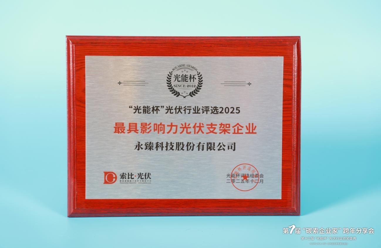 本届“光能杯”共有300余家光伏企业参与报名评选,角逐年度荣誉。此次颁奖盛典中,永臻科技股份有限公司凭借强大创新力、出色的品质与服务、卓越的品牌影响力,荣膺2025年度最具影响力光伏支架企业。