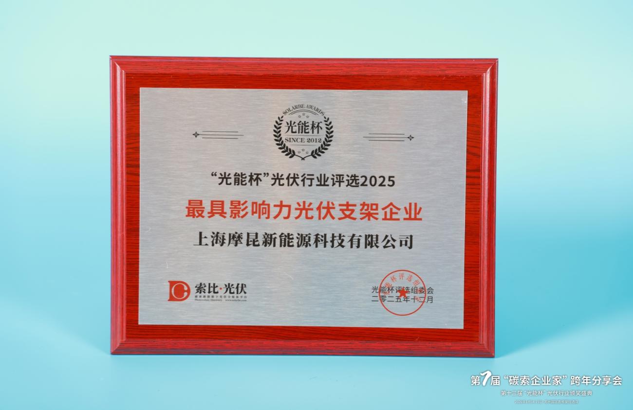 本届“光能杯”共有300余家光伏企业参与报名评选,角逐年度荣誉。此次颁奖盛典中,上海摩昆新能源科技有限公司凭借强大创新力、出色的品质与服务、卓越的品牌影响力,荣膺2025年度最具影响力光伏支架企业。
