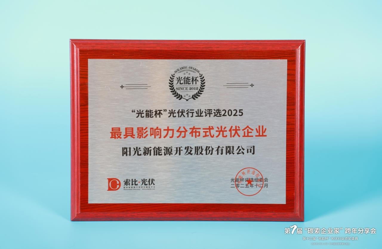 本届“光能杯”共有300余家光伏企业参与报名评选,角逐年度荣誉。此次颁奖盛典中,阳光新能源开发股份有限公司凭借强大创新力、出色的品质与服务、卓越的品牌影响力,荣膺2025年度最具影响力分布式光伏企业。