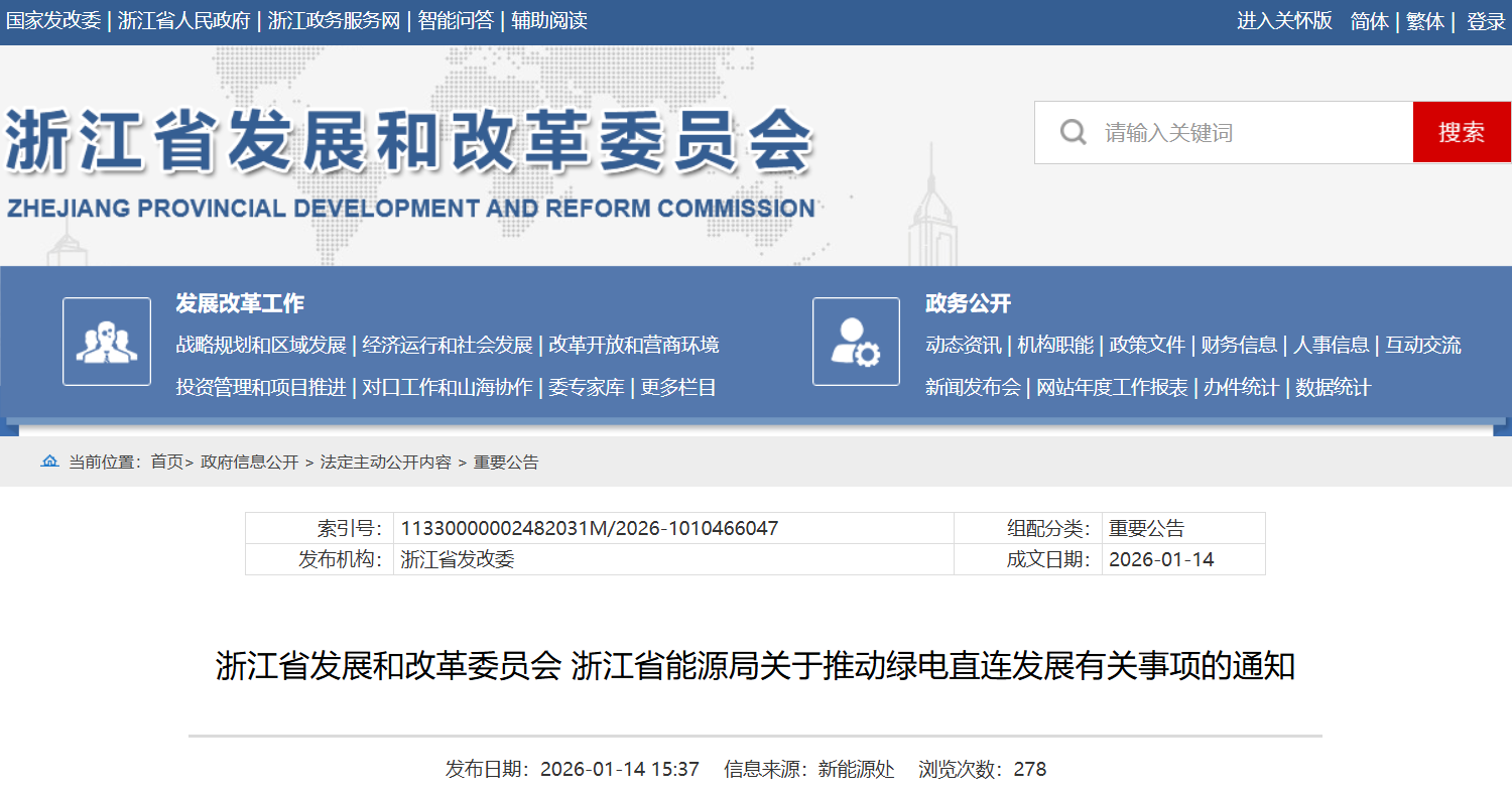 1月14日,浙江省发展和改革委员会、浙江省能源局发布关于推动绿电直连发展有关事项的通知。通知指出:鼓励建设模式创新,绿电直连项目原则上由负荷主体作为主责单位。鼓励民营企业在内的各类经营主体(不含电网企业)投资绿电直连项目。项目电源可由负荷主体投资,也可由发电企业或双方成立的合资公司投资,直连专线原则上应由负荷、电源主体投资。