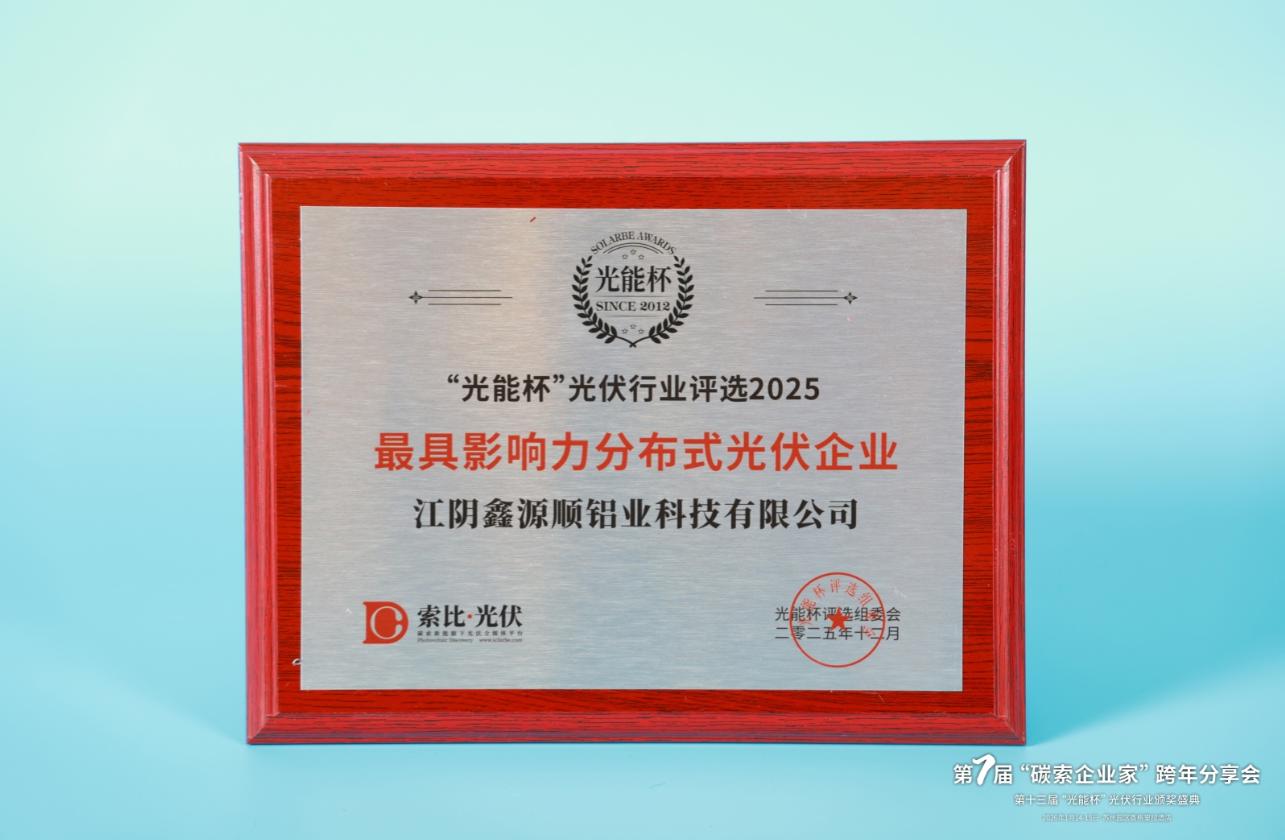 本届“光能杯”共有300余家光伏企业参与报名评选,角逐年度荣誉。此次颁奖盛典中,江阴鑫源顺铝业科技有限公司凭借强大创新力、出色的品质与服务、卓越的品牌影响力,荣膺2025年度最具影响力分布式光伏企业。