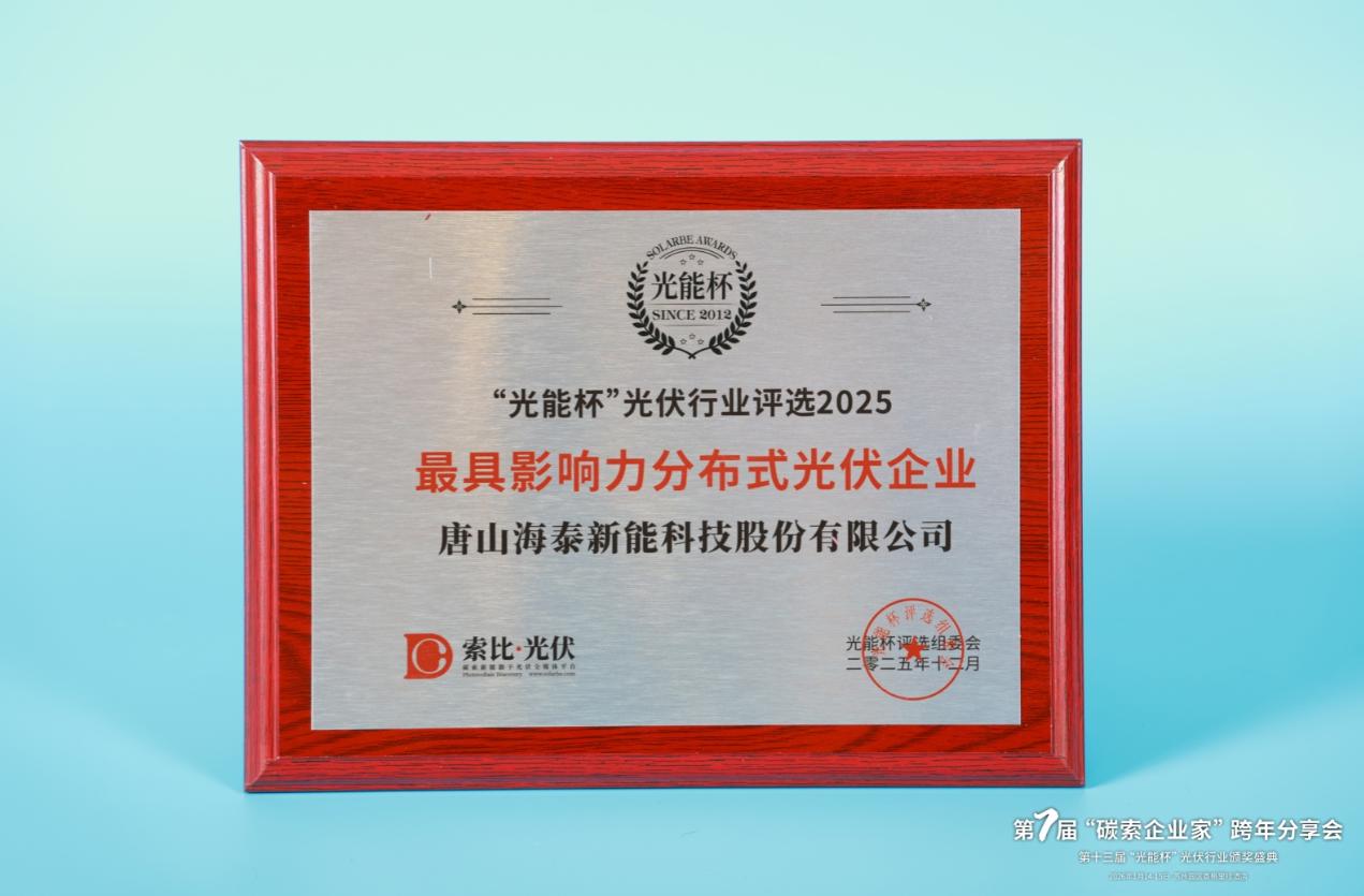 本届“光能杯”共有300余家光伏企业参与报名评选,角逐年度荣誉。此次颁奖盛典中,唐山海泰新能科技股份有限公司凭借强大创新力、出色的品质与服务、卓越的品牌影响力,荣膺2025年度最具影响力分布式光伏企业。