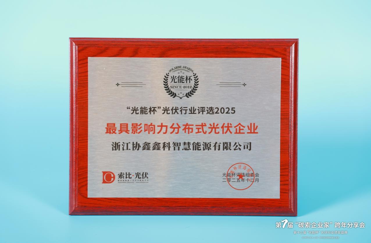 本届“光能杯”共有300余家光伏企业参与报名评选,角逐年度荣誉。此次颁奖盛典中,浙江协鑫鑫科智慧能源有限公司凭借强大创新力、出色的品质与服务、卓越的品牌影响力,荣膺2025年度最具影响力分布式光伏企业。