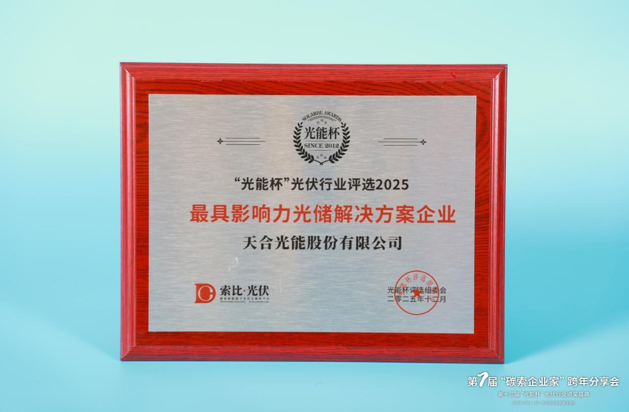 本届“光能杯”共有300余家光伏企业参与报名评选,角逐年度荣誉。此次颁奖盛典中,天合光能股份有限公司凭借强大创新力、出色的品质与服务、卓越的品牌影响力,荣膺2025年度最具影响力光储解决方案企业。