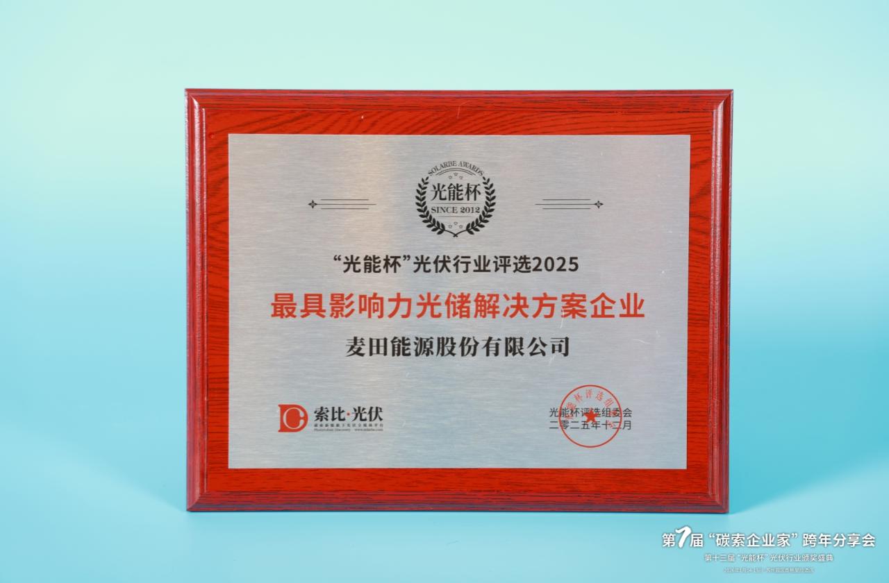 本届“光能杯”共有300余家光伏企业参与报名评选,角逐年度荣誉。此次颁奖盛典中,麦田能源股份有限公司凭借强大创新力、出色的品质与服务、卓越的品牌影响力,荣膺2025年度最具影响力光储解决方案企业。