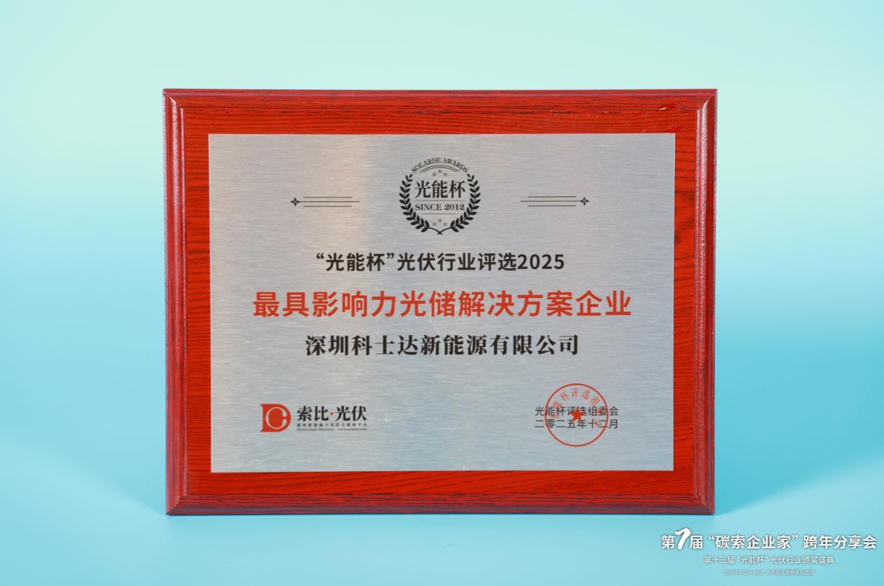 本届“光能杯”共有300余家光伏企业参与报名评选,角逐年度荣誉。此次颁奖盛典中,深圳科士达新能源有限公司凭借强大创新力、出色的品质与服务、卓越的品牌影响力,荣膺2025年度最具影响力光储解决方案企业。
