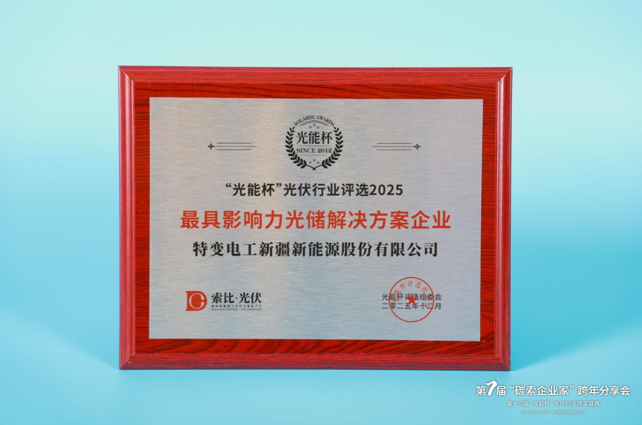 本届“光能杯”共有300余家光伏企业参与报名评选,角逐年度荣誉。此次颁奖盛典中,特变电工新疆新能源股份有限公司凭借强大创新力、出色的品质与服务、卓越的品牌影响力,荣膺2025年度最具影响力光储解决方案企业。